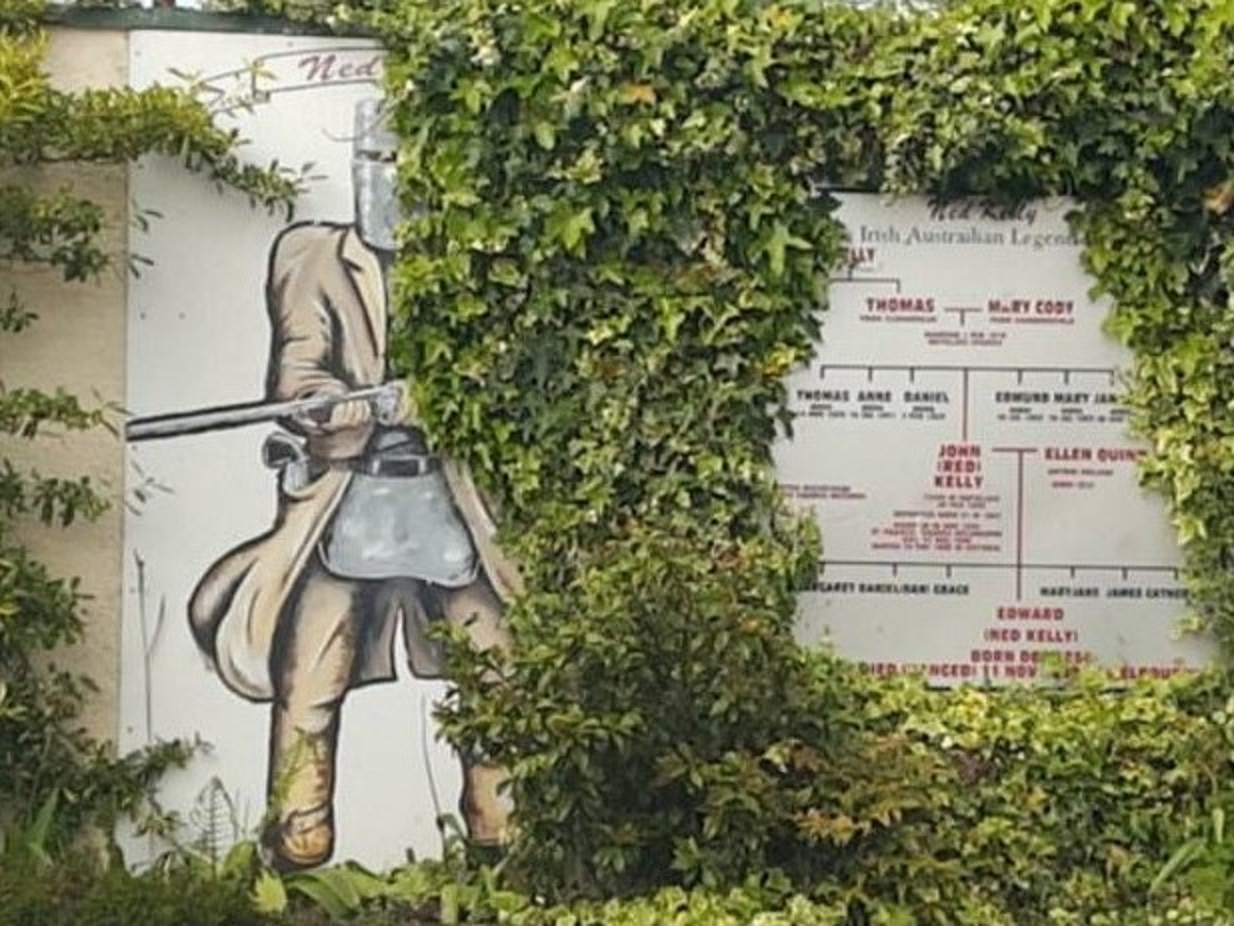 There’s a stone wall outside the pub. On the wall, overgrown with ivy, is a picture of Ned and his Kelly family tree. They’re all ghosts now in the sleepy Irish village, an eternal tribute by the folk of Moyglass to their son Red, his notorious offspring, and the people of Australia. Major Cheape is long forgotten.