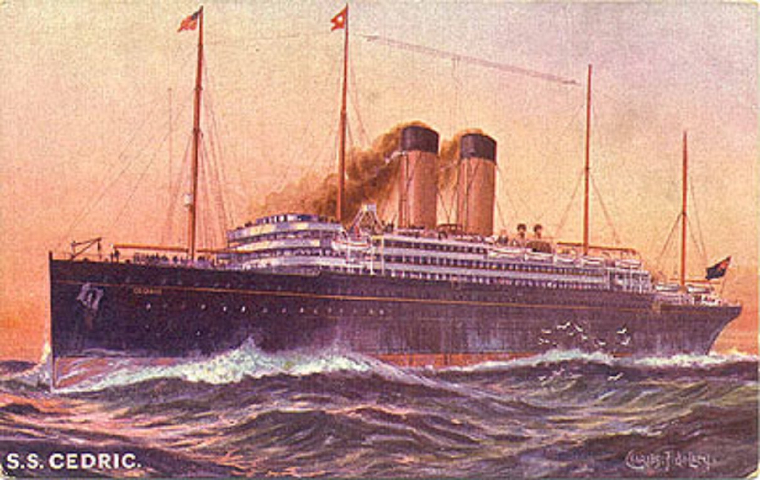 The White Star Liner Cedric – painting by Charles DeLacy, Wikipedia Public Domain