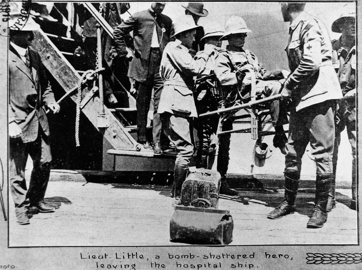 Lieutenant Little a bomb-shattered hero leaving a hospital ship – The Queenslander 11 December 1915 p27 – State Library of Queensland