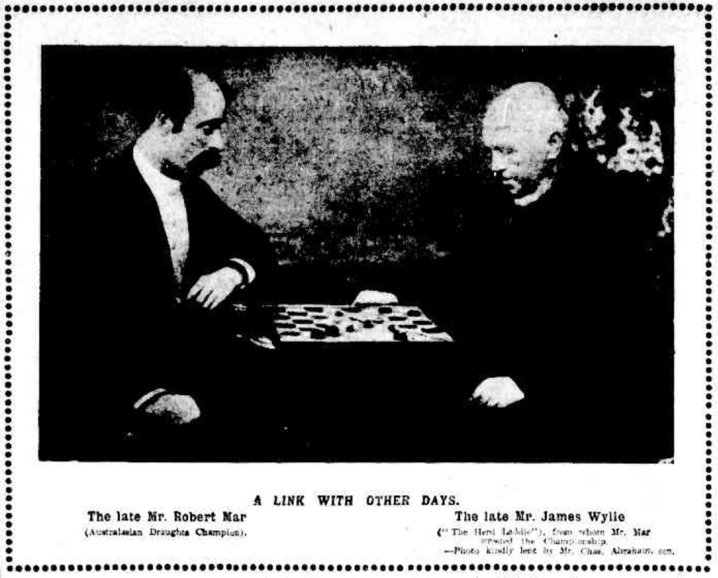 1. Good photo of Robert Mar & James Wyllie playing in their Brisbane matches in 1890. Wyllie died in 1899 and Mar followed in 1908. We need photos of the great players in the public arena.I am helping Richard Torning of the NSW Junior Chess League Journal write a history of Australian Draughts.