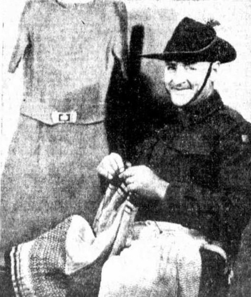 Jim was photographed wearing a jumper that he’d knitted for himself, and on his head was a tea cosy that had won him first prize at a country show. He and his wife spent their time at nights knitting together while listening to the wireless.