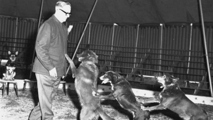 Kelpie dogs with their trainer Adrian St Leon in the Ridgways Circus – Canterbury Stories NZ