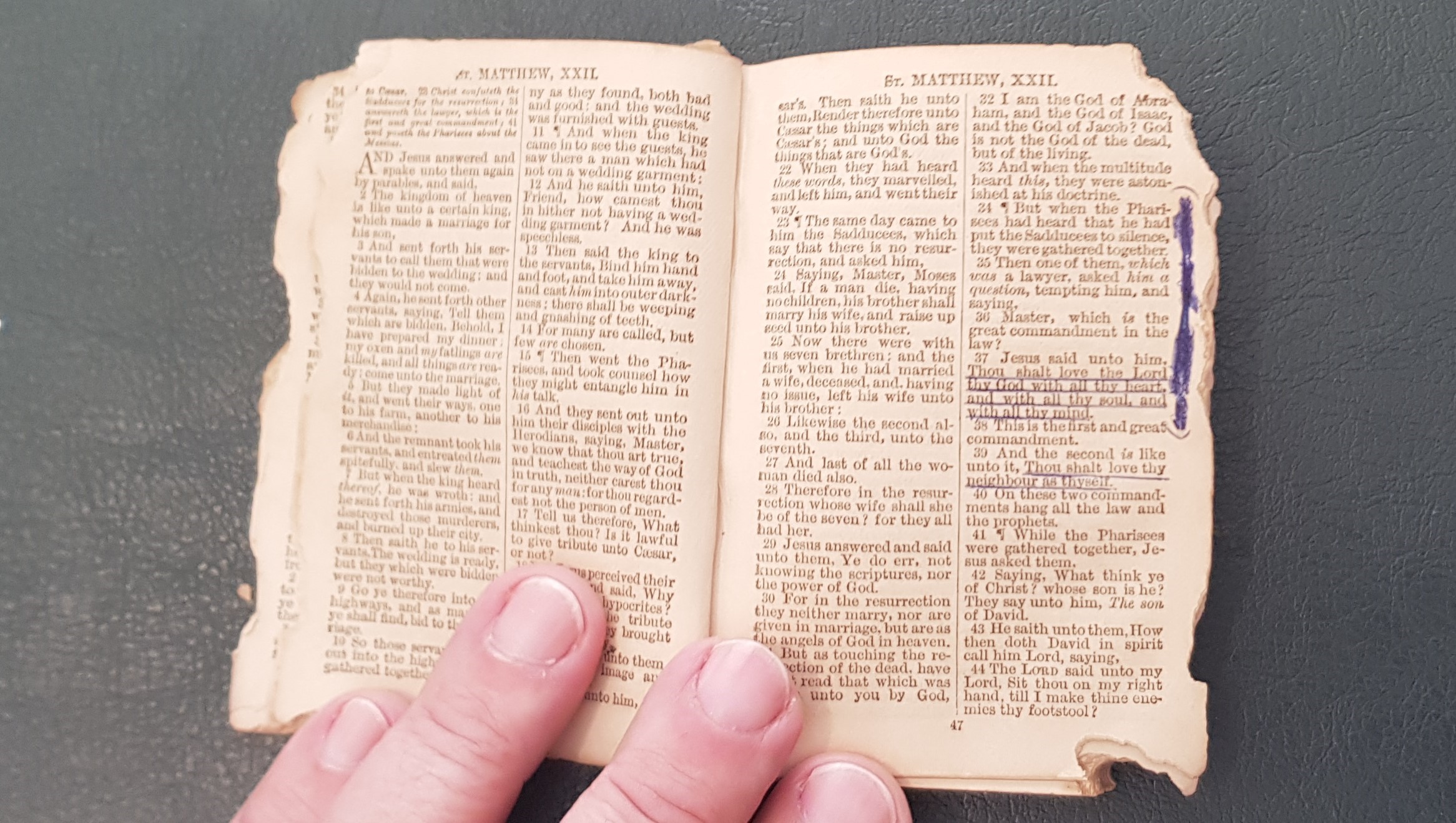The boy signed his name and the date inside the front cover and pressed a small flower between its pages. He would later underline his favourite verses. The boy and his bible went on a journey through time only to be lost, and then found again.