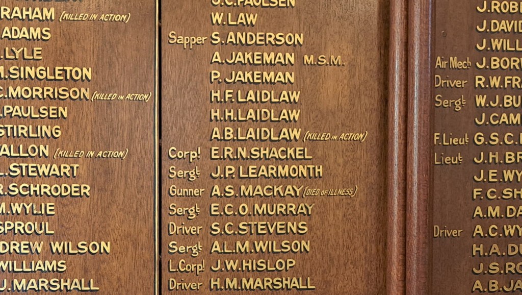 All three of the Laidlaw brothers who went to war are today commemorated in their mother’s Mowbray Town Presbyterian Church in East Brisbane. The church was built on land donated by Ipswich’s Elizabeth Mowbray formerly Macalister.