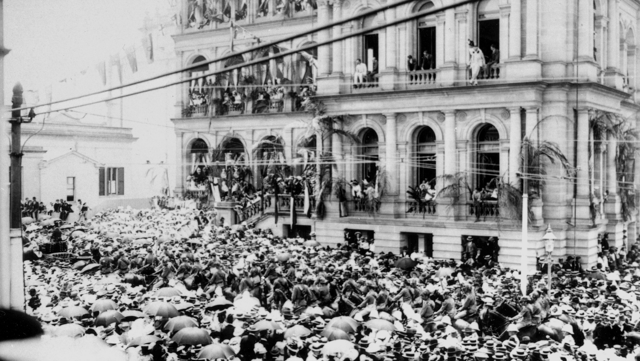 Lord Lamington leaves Treasury Building after reading Proclamation of the Commonwealth, Brisbane ,1901 – State Library of Queensland.