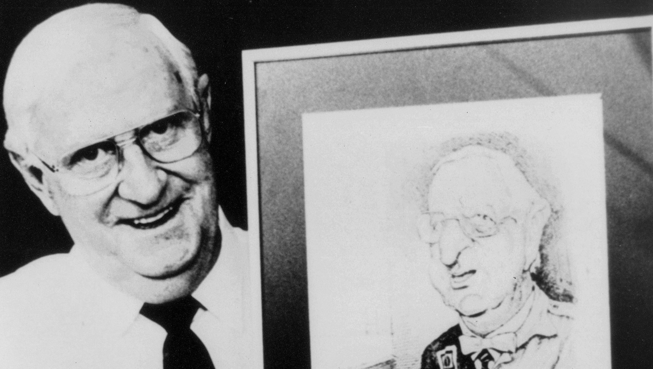 Ron McAuliffe holding a framed cartoon of himself drawn by Ricardo – State Library of Queensland.