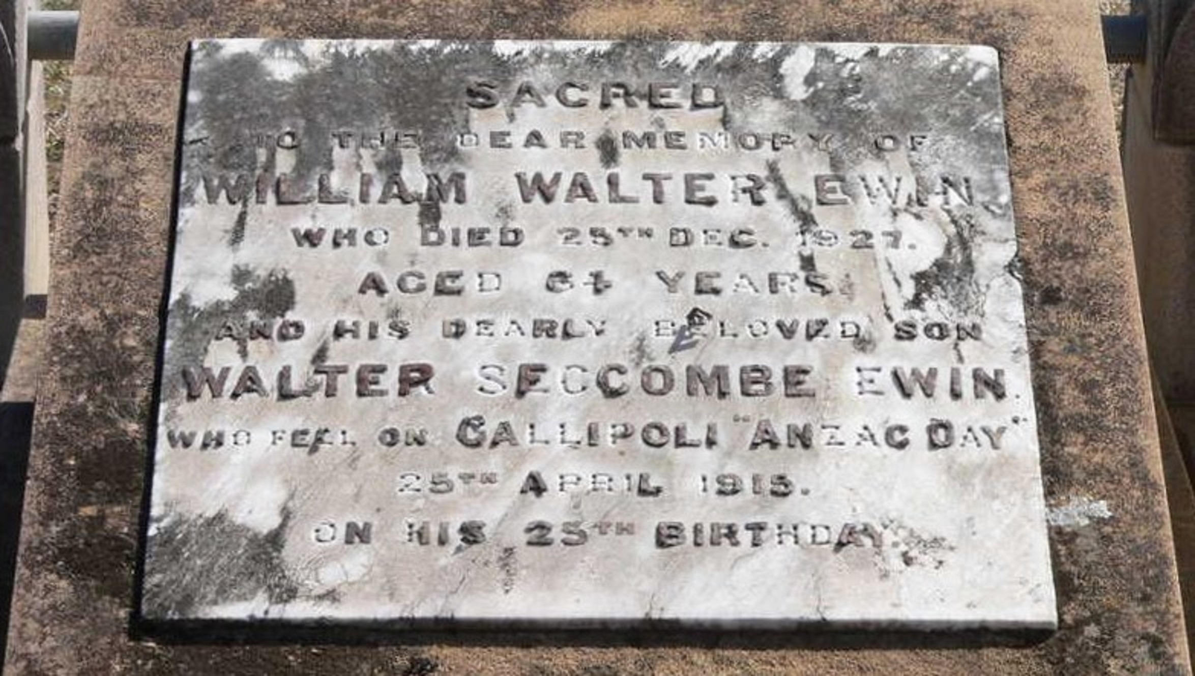 The headstone says that Walter fell at Gallipoli on the first Anzac Day the 25th of April 1915, which in fact was Walter’s 25th birthday. He’s the only Australian soldier in that first wave who was killed on his birthday that first Anzac Day.