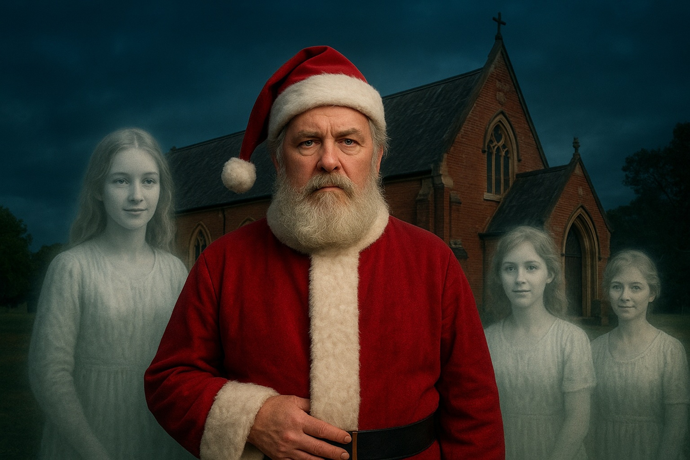 Representation of Joseph Garrett as Santa Claus with his three wives at St John’s Church, Dalby – ChatGPT Image.