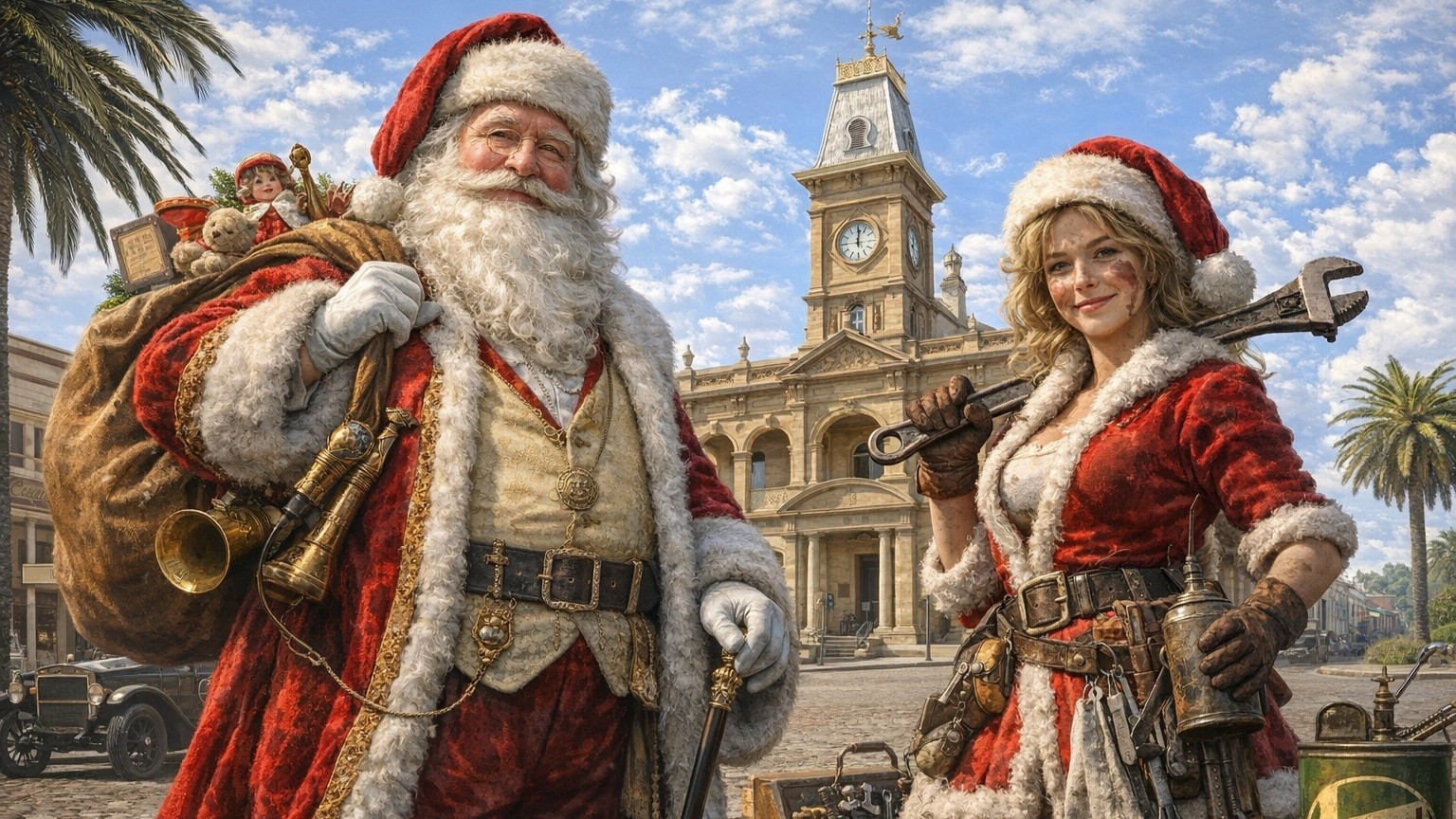 Depiction of Allora and Warwick Father Christmases – ChatGPT.