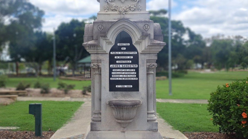 The Sangster Memorial (pictured above) in Ipswich, Queensland, commemorates a hero policeman who drowned in 1893, but there was another amazing forgotten hero that day. I told a version of this story live on Ipswich’s West Bremer Radio.