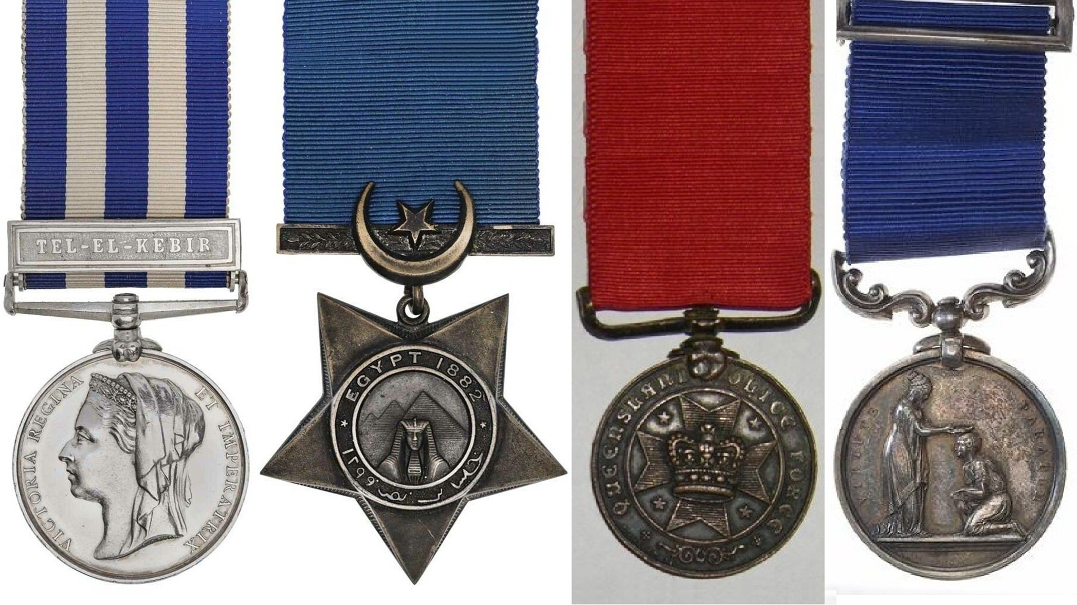 Egypt Medal, Khedive Star, Queensland Police Medal, Royal Humane Society Silver Medal – various sources.