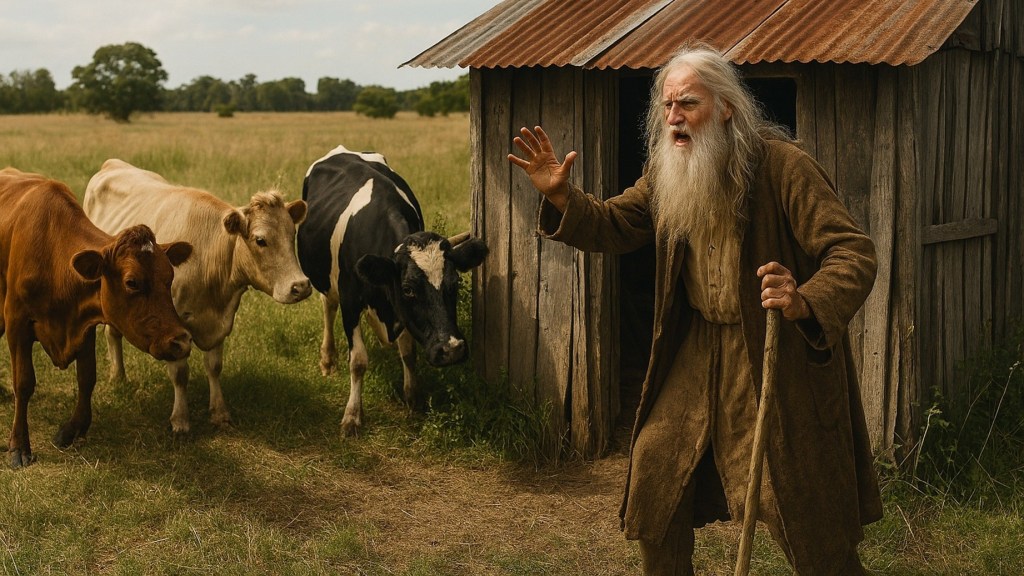Representation of deaf-mute hermit Richard Middlestadt and the offending cows, 1930 – CoPilot image.